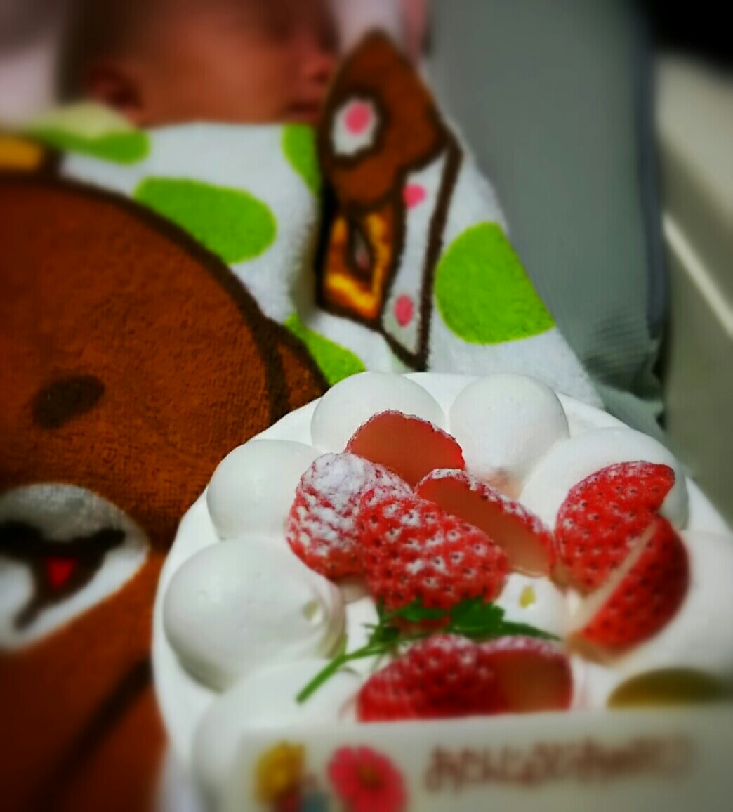 父母と娘と、誕生(祝)1ヶ月ケーキでお祝いしました。