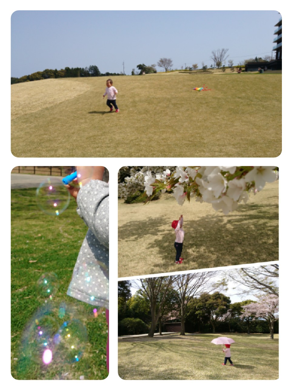 桜の散る花びらを傘をさして楽しんだり、はじめてのカイトをしたり。