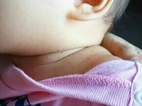 指をカミカミしヨダレが出て、首のしわに入り込み炎症。